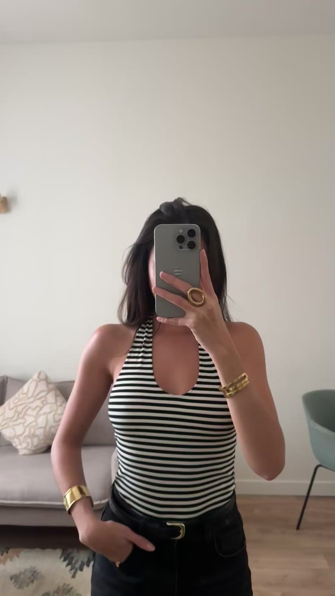 Un body structuré, visuellement marquant, qui met en valeur la silhouette grâce à son imprimé vertical et sa coupe près du corps.